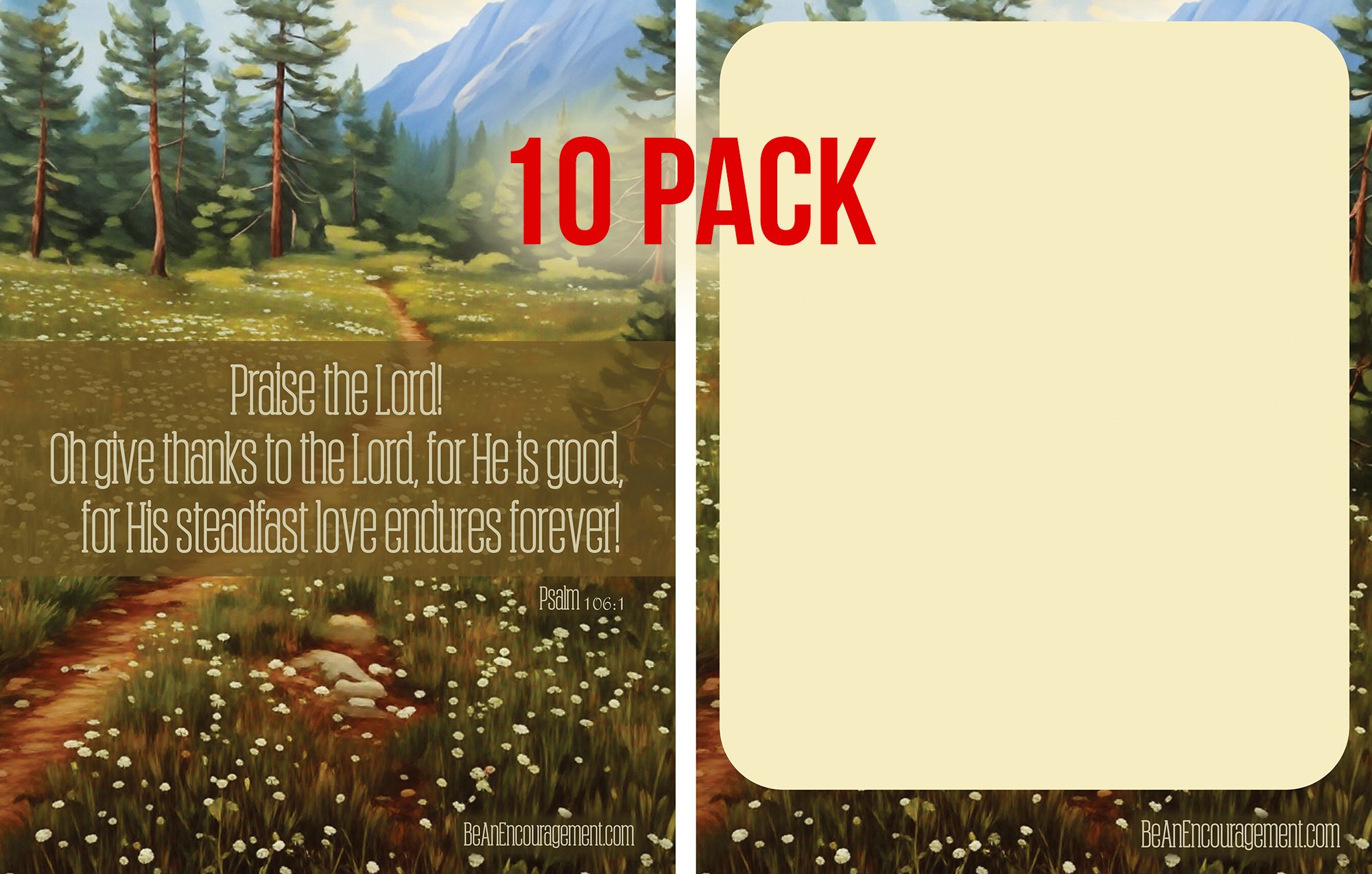 This is our very thick (32 pt) full color card with a metallic gold edge. The front features Psalm 106:1 and the back gives room for an encouraging hand written note. An envelope is included for each card.